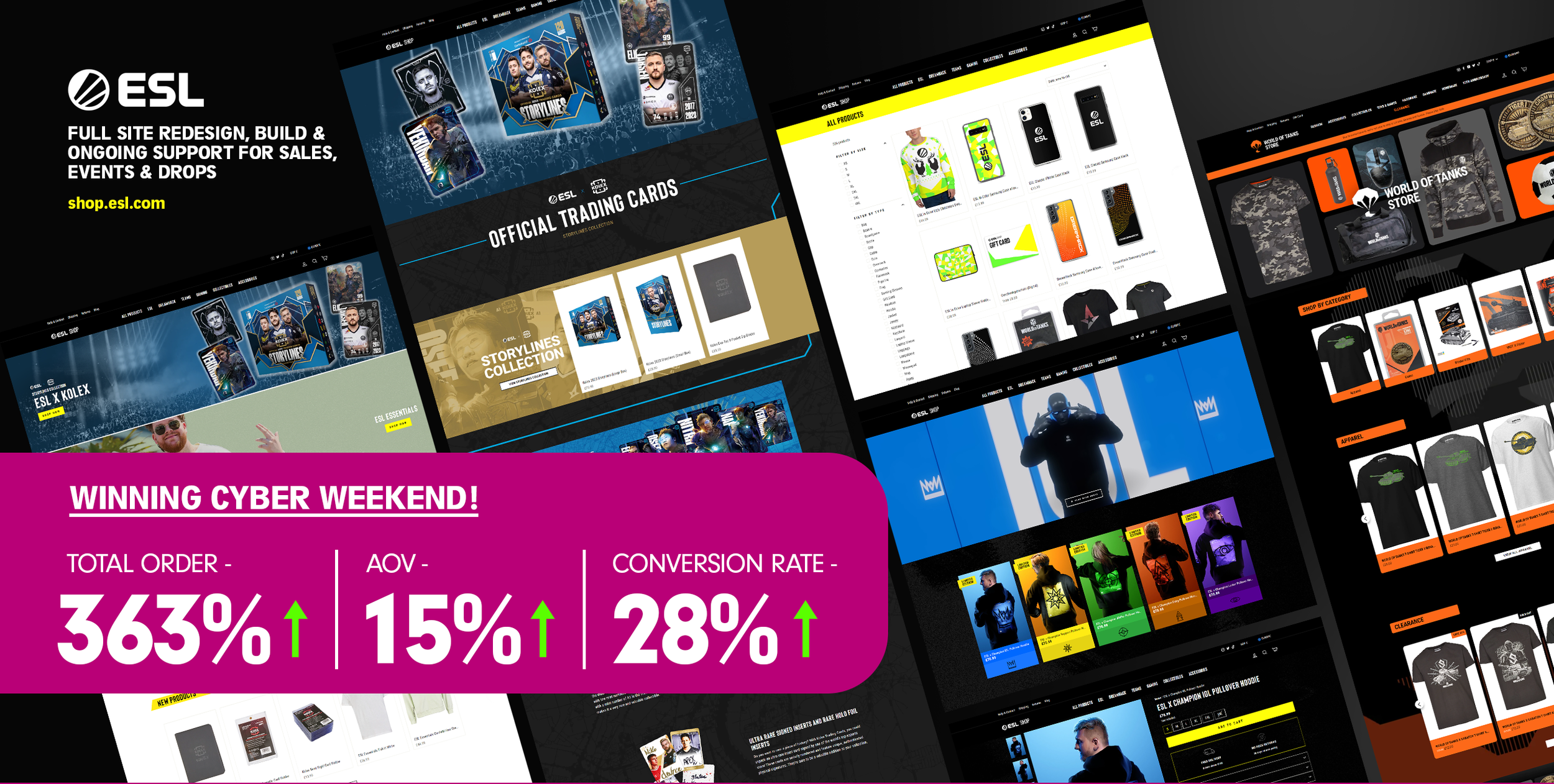 The Electronic Sports League, commonly referred to as ESL, is perhaps the world's most well-known and respected esports organisation. It organises competitions around the world, hosting some of the largest and most lucrative events on the esports calender. I am the lead designer & designer for a number of campaign landing page designs, as well as making incremental design updates to the ESL shop.